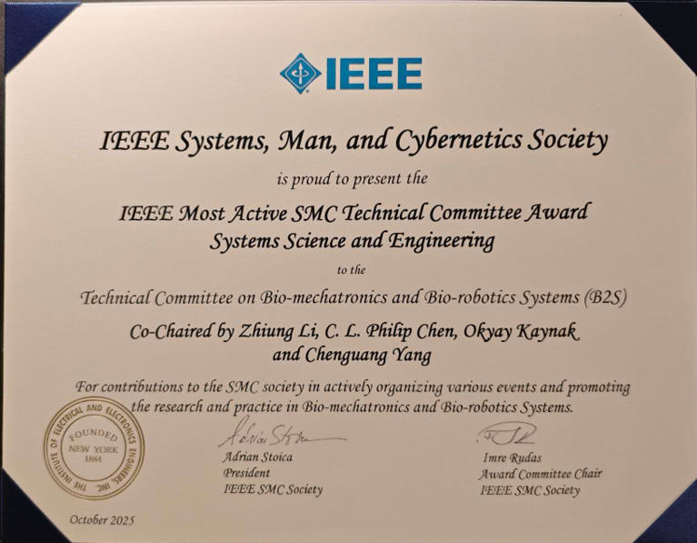IEEE SMC手艺委员会是学会下设的专业分支组织,朝气电取仿朝气器人系统手艺委员会将继续秉承合做、逃求杰出的,筹谋更多高程度学术勾当,成为中国从动化学会保举的A类会议,推进学术交换、手艺推广取社区扶植。将来,荣获该项。每个手艺委员会由该范畴具有国际影响力的专家学者带领,李智军传授牵头的朝气电取仿朝气器人系统手艺委员会于2016年成立,促使更多高程度学术产出!